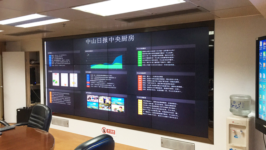 新媒體4k拼接屏_中山日報(bào)社中央廚房_信弘55寸拼接屏項(xiàng)目,新聞生產(chǎn)更有效率,更符合當(dāng)代新聞傳播的特點(diǎn),更好的滿足用戶需求,從而加強(qiáng)內(nèi)容供給側(cè)改革,加速日報(bào)社向新媒體轉(zhuǎn)型。