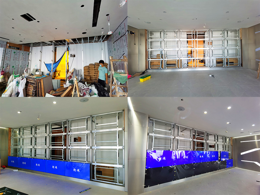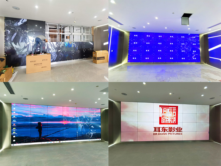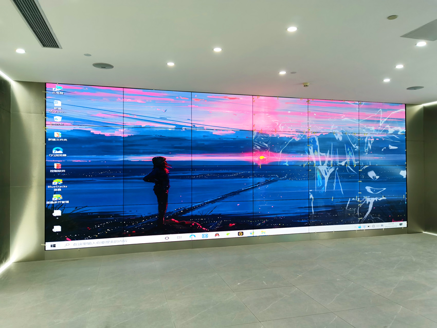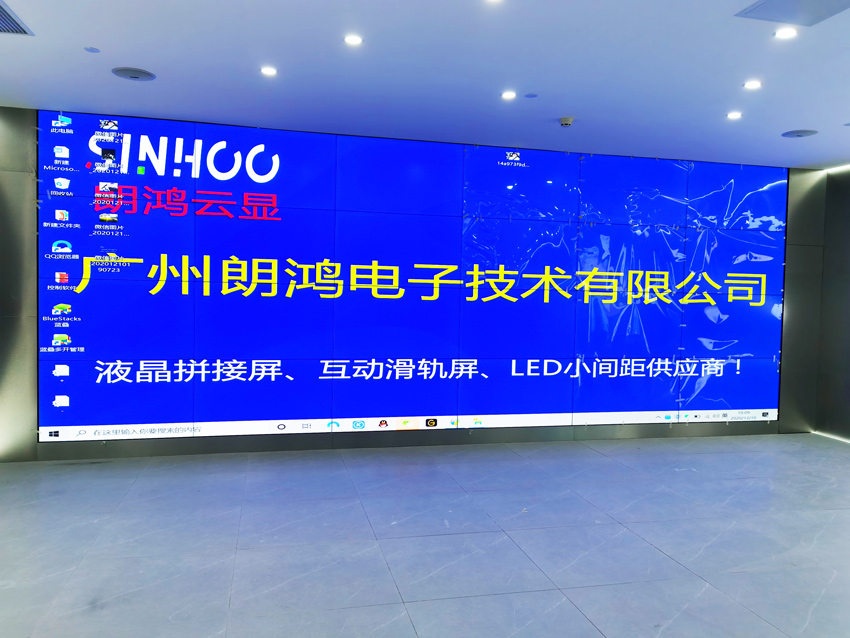 此項目由4×655寸1.7mm拼接屏在廣州天河區某公司展廳投入使用,顯示效果超過客戶預期。該用戶在CBD甲級寫字樓辦公,采用24塊1.7mm拼縫的拼接屏。